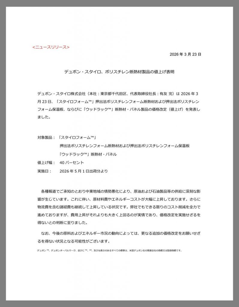 特に恐ろしいのはスタイロフォームなどの断熱材が40%値上げになることです。